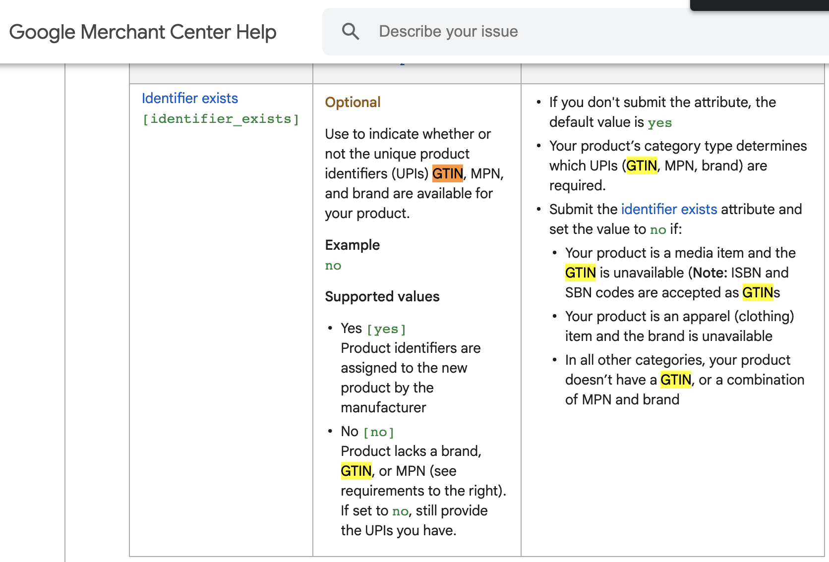 If you sell your own products, you likely do not have GTINs, but fret not, there is a way around it. According to Google Merchant Center Help about Product Identifiers, you need to add code in that tells search engines that identifiers do not exist. See Image Below: